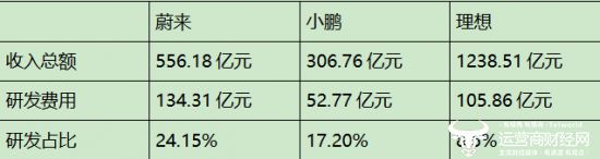 也就是说在三家车企中,理想汽车收入总额最高,达到蔚来汽车收入总额的二倍,达到小鹏汽车收入总额的四倍,但是研发占比最低。