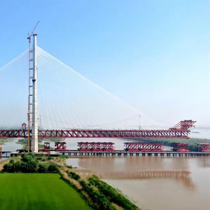 作为巢马城际铁路的控制性工程,马鞍山长江公铁大桥主汊航道桥为三塔两主跨三索面钢桁梁斜拉桥。三座主塔中,Z3、Z5号为A型边塔,已实现封顶;Z4号主塔为四肢空间结构,纵横向均为A型,塔高345.6米,其中上塔柱钢塔部分高118.5米。钢塔施工共分39个节段进行吊装,自去年10份开始施工。
