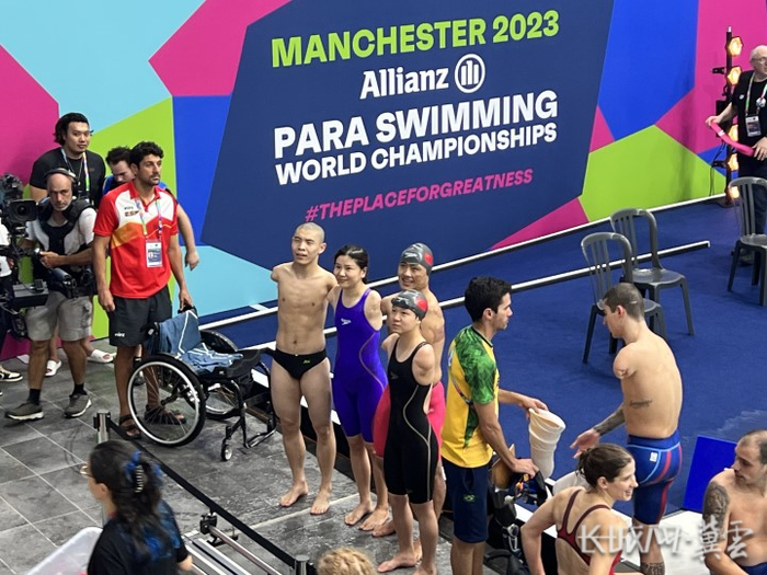2023年8月,郭金城(中间左一)与队友在英国曼彻斯特举行的2023年世界残奥游泳锦标赛中。