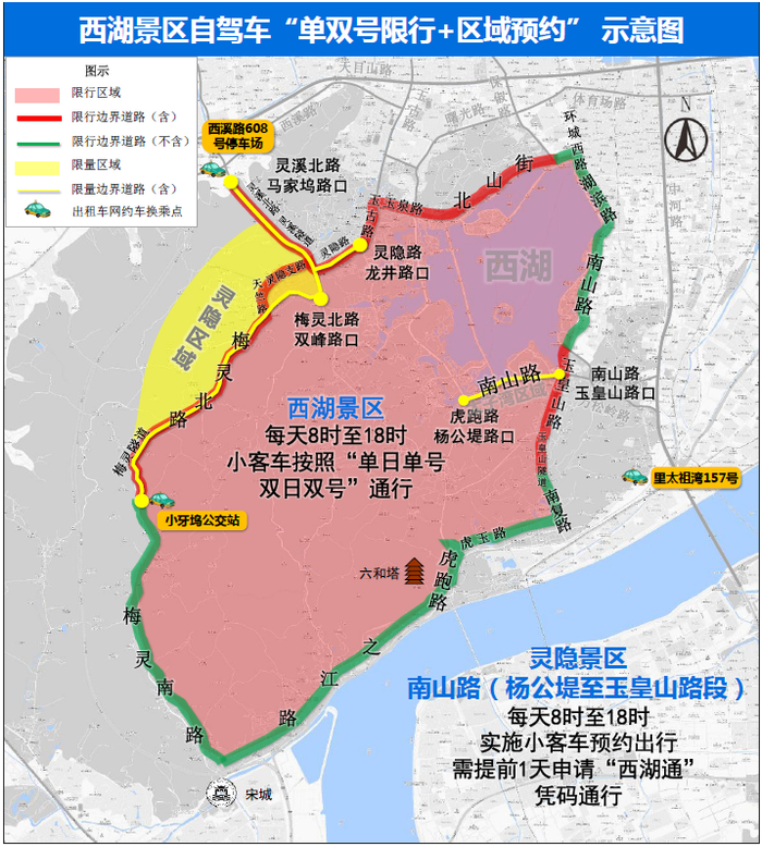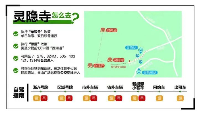 灵隐景区、南山路(杨公堤至玉皇山路段)实施小客车预约出行,需提前一天通过“警察叔叔、浙里办、支付宝”等APP申请“西湖通”,凭码通行;同时,这两个区域禁止网约车、出租车驶入,乘客可在西溪路608号、小牙坞、里太祖湾157号换乘公交接驳线进入。