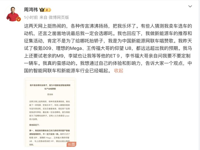 周鸿祎写道:“这两天网上挺热闹的,各种传言沸沸扬扬,把我乐坏了。有些人猜测我卖车选车的动机,还言之凿凿地说最后我一定会选哪吒。我也回应下,我做新能源车的推荐和征集活动,肯定不是为了给哪吒抬轿子,我是为中国新能源网联车唱赞歌。我昨天试了极氪009、理想的Mega、王传福大哥的仰望U8,都远远超出我的预期。我马上还要试老余的M9,李斌也让我等等他的ET9,李书福大哥亲自问我要不要定制一辆车。我真的蛮感动的。我想通过自己的体验和影响力,告诉大家一个观点,中国的智能网联车和新能源车行业已经崛起。”