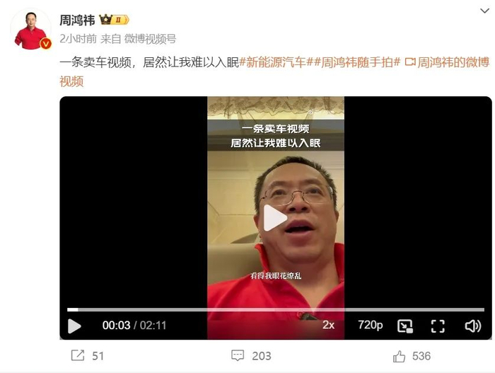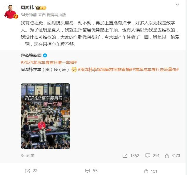 周鸿祎随后在微博回应称:“我有点社恐,面对镜头容易一动不动,再加上直播有点卡,好多人以为我是数字人。为了证明是真人,我就发挥攀岩优势爬上车顶。也有人误以为我是去维权的。我没什么可维权的,大家的车都做得很好,今天国产车体验了一圈,我是见一辆爱一辆,现在只担心车牌不够。”