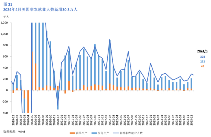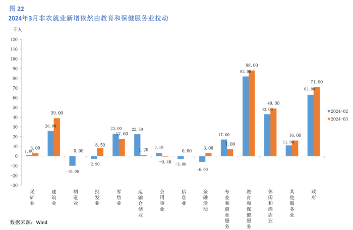 3月,美国新增非农人数录得30.3万人,较2月增长3.3万人 (图 21)。医疗保健、政府和建筑业的就业机会增加,成为3月非农就业的主要拉动力(图22)。