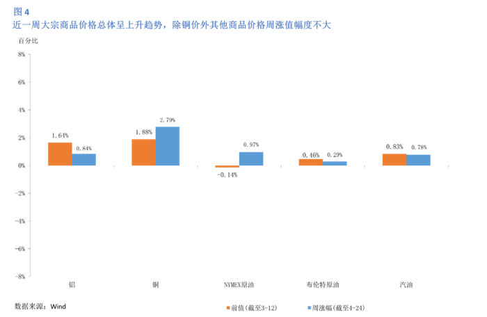 截至4月24日,大宗商品价格总体呈上升趋势,除铜价格外其他商品价格周涨值幅度不大(图4)。汽油价格自四月起持续上升,本周上涨了0.78%,录得3.27美元/加仑(图5)。布伦特原油价格在近一周下降后,本周增长了0.29%,达到87.67美元/桶(图6)。美国西德克萨斯中质原油(WTI)价格下降幅度也渐缓,在4月24日价格录得83.66美元/桶,涨幅0.97%(图7)。LME铝价在近两个月上涨后,目前涨势渐缓,截至4月24日录得2,591.5美元/吨,较上周价格上涨了0.84%(图8)。而LME铜价近一周涨势依旧迅猛,较上周增长了2.79%,4月24日录得9,814美元/吨(图9)。