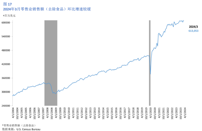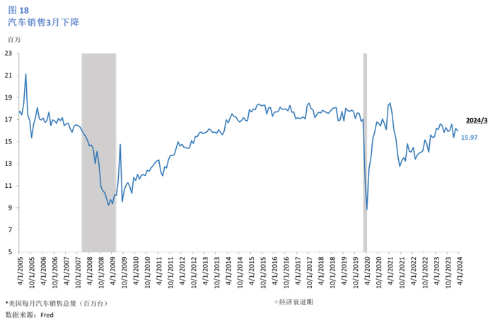 据美国普查局4月23日发布的报告,3月美国零售业销售额(去除食品)环比上升0.74%(图17),增速较缓。汽车销售继1月大幅下降、2月上升后,3月销售量下降,但幅度较小。于3月录得1596.7万台,环比下降1.41% (图 18) 。