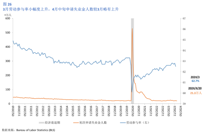 3月U-3失业率录得3.8%,较2月下降0.1个百分点。U-6失业率录得7.3%,和上月持平(图 23)。3月劳动参与率为62.7%,较2月上升0.2个百分点,是2024年以来的最高水平。截止到4月20日,初次申领失业金人数为21.3万人,较3月上升0.1万人(图 24)。