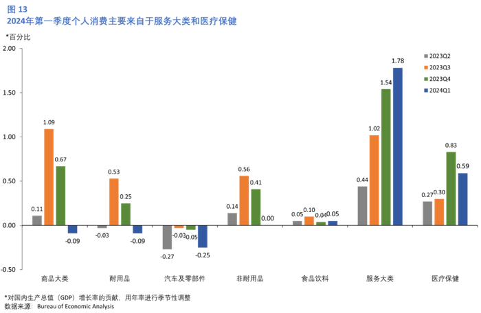 第一季度实际GDP的总体增长反映了消费者支出、住宅固定投资、非住宅固定投资以及州和地方政府支出的增长。GDP的总体增长主要由个人消费支出拉动,但私人投资的减少部分抵消了这一增长(图12)。分行业看,消费支出的增长主要来自于服务支出的增长,但部分被商品支出的减少所抵消。在服务方面,增长主要来自于医疗保健以及金融服务和保险(图13)。在商品方面,减少主要来自于汽车及零部件以及汽油和其他能源商品。在住宅固定投资中,经纪人佣金和其他所有权转让成本以及新的单户住宅建设带动了投资的增长。而非住宅固定投资的增长主要反映了知识产权产品的增长。国家和地方政府支出的增加反映了国家和地方政府雇员报酬的增加。存货投资的减少主要来自于了批发贸易和制造业的减少。进口增长反映了商品和服务的增长。