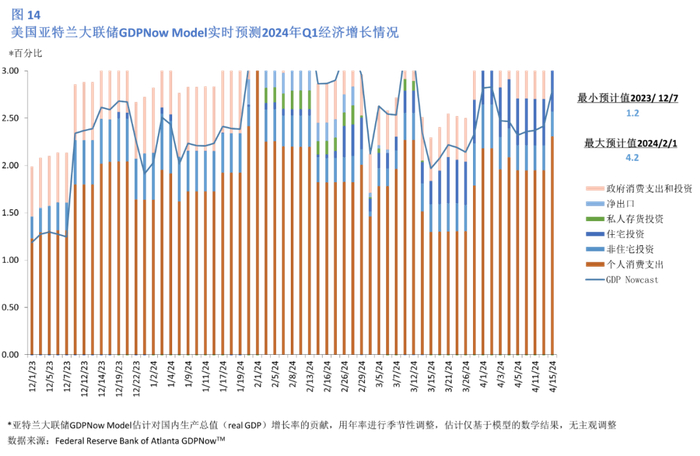 根据亚特兰大联邦储备银行对美国实际GDP增速的实时估测模型,美国2024年第一季度GDP增速为3.9%。根据美国经济分析局4月26日公布的数据,美国一季度实际GDP增速约为1.6%(图14)。