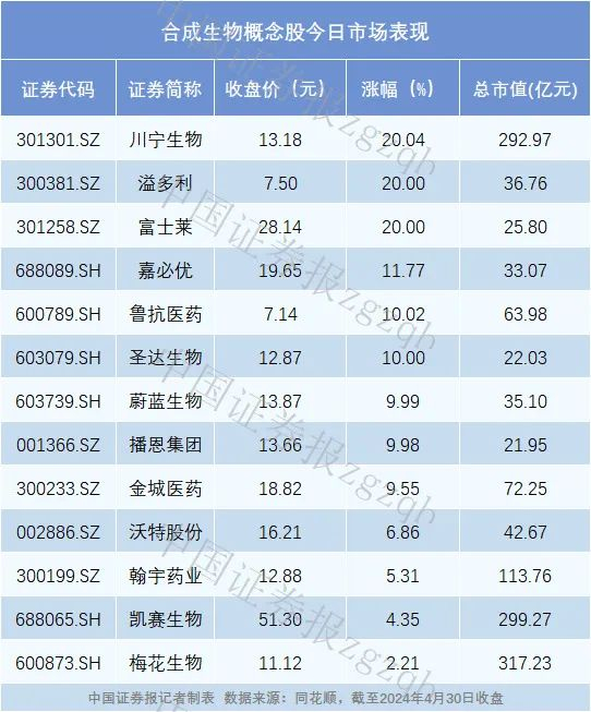 4月最后一个交易日,合成生物概念表现强势。同花顺概念板块中,合成生物概念人气排名第一。截至当日收盘,川宁生物、溢多利、富士莱“20CM”涨停,鲁抗医药、圣达生物、蔚蓝生物等涨停。