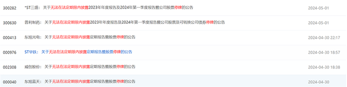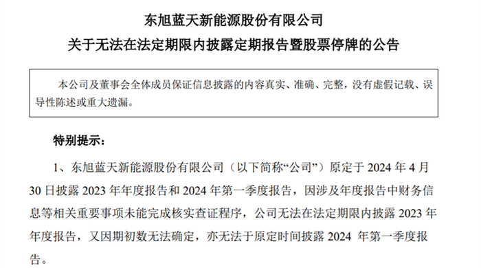 首先来看“东旭系”两家公司。东旭蓝天和东旭光电两家公司原本约定在4月30日披露2023年年报和2024年一季报,但到了4月30日当天,两家公司同时发布公告称,无法按期披露定期报告。对于年报“难产”,两家公司的说法一致:财务信息等相关重要事项未能完成核实查证程序。