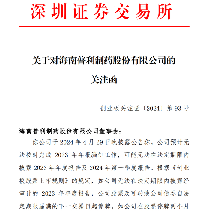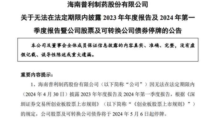 普利制药公告称,公司因无法在法定期限内(4月30日)披露2023年年度报告及2024年第一季度报告,根据相关规定,公司股票及可转换公司债券将于5月6日起停牌。