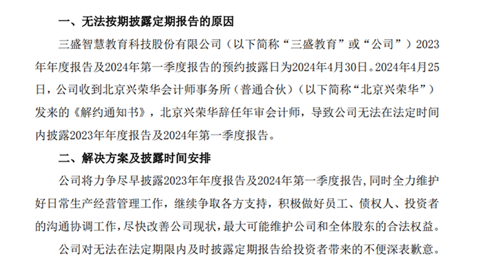对于无法按期披露年报,*ST三盛称力争尽早披露2023年年度报告及2024年第一季度报告,同时全力维护好日常生产经营管理工作。