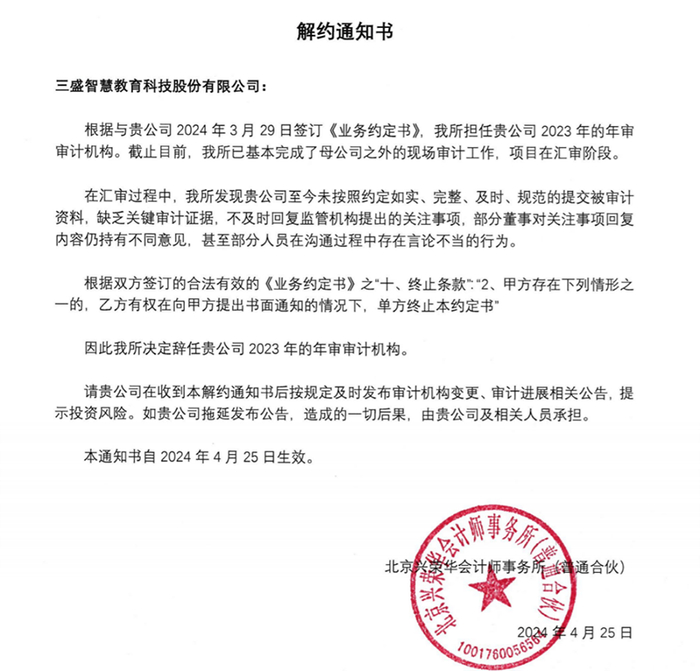 对于“临阵”解约,北京兴荣华也给予详细说明。在4月25日向*ST三盛发出的解约通知书中,北京兴荣华措辞严厉,并给出解约三大原因:一是公司至今未按照约定如实、完整、及时、规范地提交被审计资料,缺乏关键审计证据;二是不及时回复监管机构提出的关注事项,部分董事对关注事项回复内容仍持有不同意见;三是部分人员在沟通过程中存在言论不当的行为。