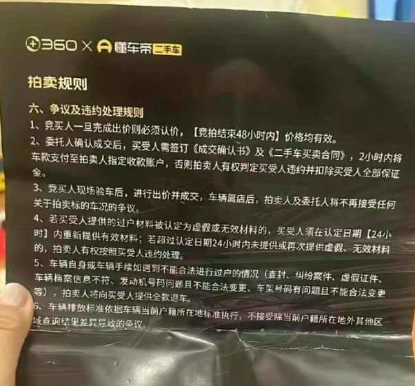 据现场二手车商发布的拍卖规则显示,竞买人一旦完成出价则必须认价,竞拍结束48小时内价格均有效。委托人确认成交后,买受人需签订《成交确认书》及《二手车买卖合同》,2小时内将车款支付至拍卖人指定收款账户,否则拍卖人有权判定买受人违约并扣除买受人全部保证金。