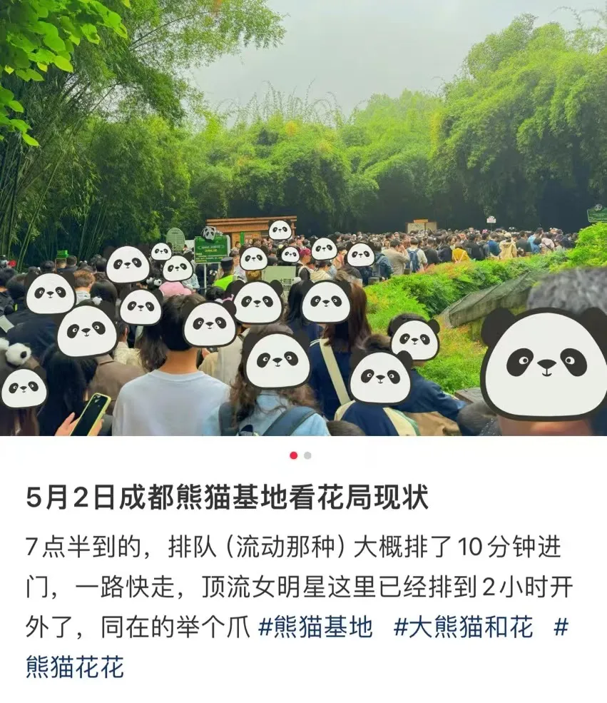 5月2日早上7点半,熊猫基地看“花局”的朋友已经排起长队,“已经排到2小时开外”。