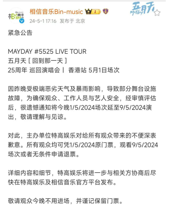 因受极端恶劣天气及暴雨影响,导致部分舞台设施故障,为确保观众、工作人员与艺人安全,经审慎评估后,很遗憾通知将今晚2024年5月1日场次延至2024年5月9日演出,敬请理解与见谅。