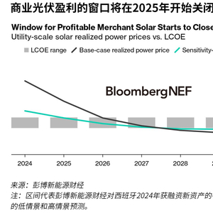 彭博新能源财经的西班牙经敏感性调整后的电价显示,商业风电的盈利窗口已经关闭,而商业光伏的盈利窗口将在2025年关闭。大宗商品价格下跌、电力需求疲软、高水力发电量以及风电和光伏发电量不断增长,已经使得商业收入低于新资产的平准化度电成本(LCOE)。