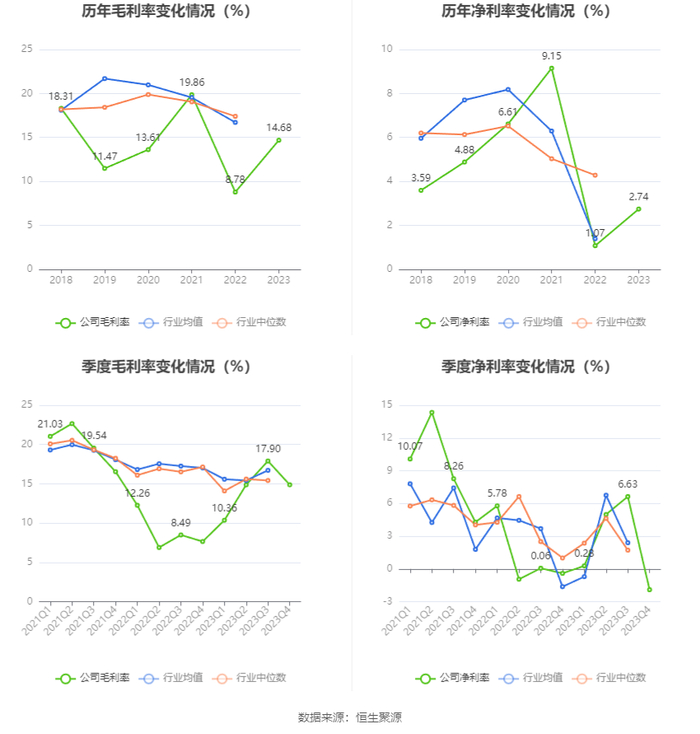 2023年,公司毛利率为14.68%,同比上升5.90个百分点;净利率为2.74%,较上年同期上升1.67个百分点。从单季度指标来看,2023年第四季度公司毛利率为14.87%,同比上升7.22个百分点,环比下降3.03个百分点;净利率为-1.91%,较上年同期下降1.50个百分点,较上一季度下降8.54个百分点。
