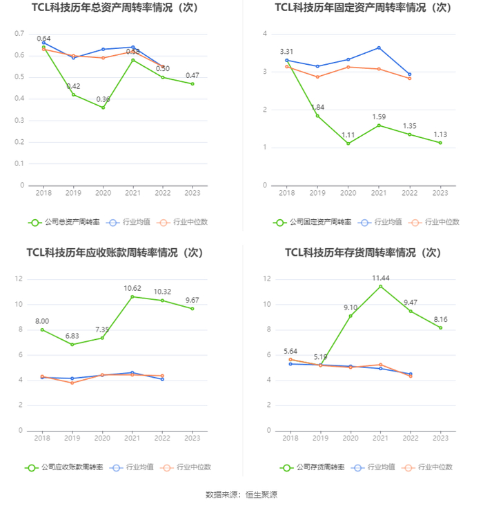 营运能力方面,2023年,公司公司总资产周转率为0.47次,上年同期为0.50次(2022年行业平均值为0.55次,公司位居同行业25/42);固定资产周转率为1.13次,上年同期为1.35次(2022年行业平均值为2.94次,公司位居同行业33/42);公司应收账款周转率、存货周转率分别为9.67次、8.16次。