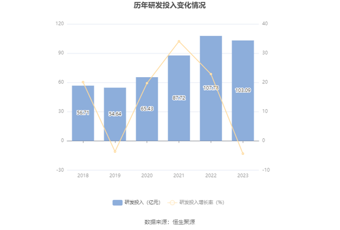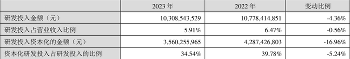 2023年全年,公司研发投入金额为103.09亿元,同比下降4.36%;研发投入占营业收入比例为5.91%,相比上年同期下降0.56个百分点。此外,公司全年研发投入资本化率为34.54%。