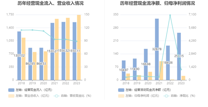 2023年,公司经营活动现金流净额为253.15亿元,同比增长37.38%;筹资活动现金流净额17.92亿元,同比减少296.09亿元;投资活动现金流净额-407.97亿元,上年同期为-468.36亿元。