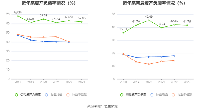 在偿债能力方面,公司2023年年末资产负债率为62.06%,相比上年末下降1.23个百分点;有息资产负债率为41.76%,相比上年末下降0.40个百分点。