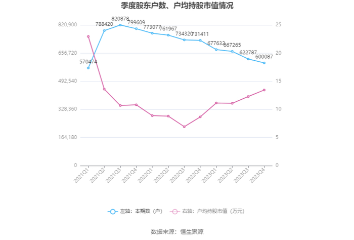 筹码集中度方面,截至2023年年末,公司股东总户数为60.01万户,较三季度末下降了2.27万户,降幅3.64%;户均持股市值由三季度末的12.30万元上升至13.46万元,增幅为9.43%。