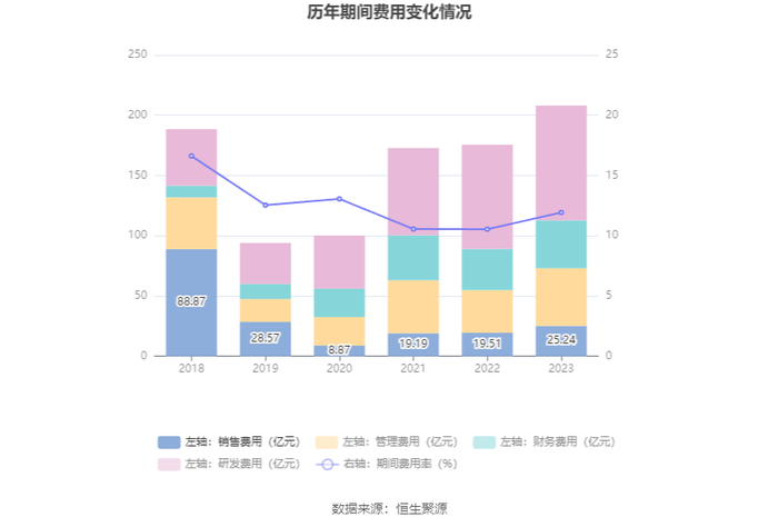 2023年,公司期间费用为208.03亿元,较上年同期增加32.55亿元;期间费用率为11.93%,较上年同期上升1.39个百分点。其中,销售费用同比增长29.38%,管理费用同比增长35.1%,研发费用同比增长10.3%,财务费用同比增长16.06%。
