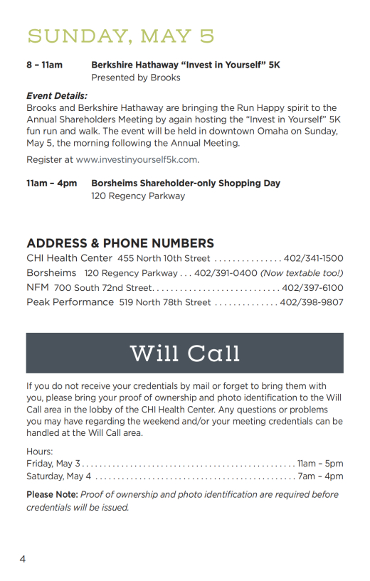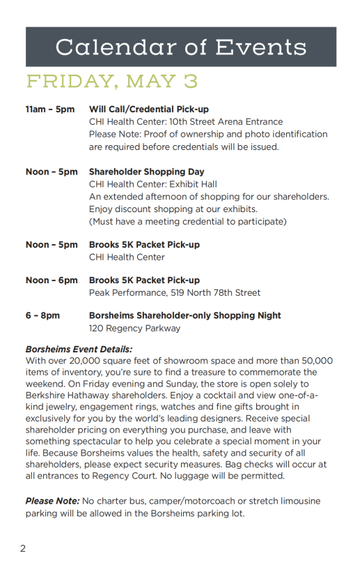 此次股东大会的会场和往年一样,在奥马哈的“CHI健康中心”举行。从大会日程安排来看,为期三日的股东大会环节也和往常类似:
