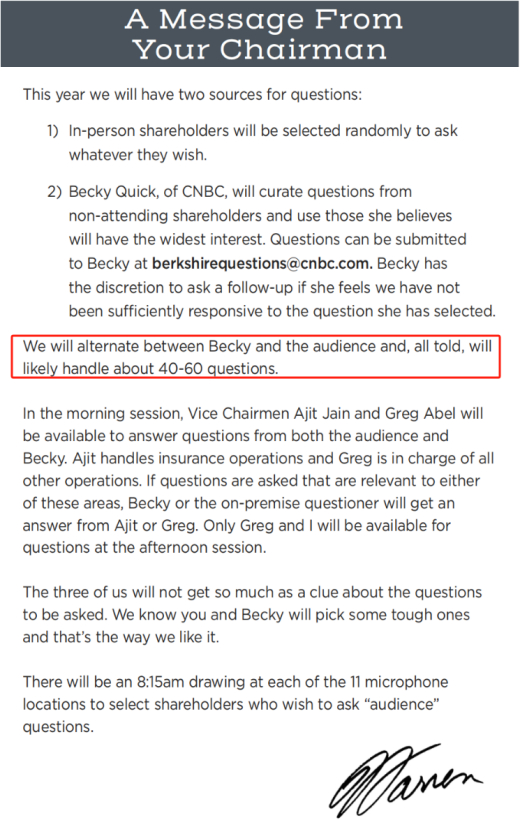 问答环节是历年股东大会最受关注的环节。根据巴菲特给出的信息,此次问答环节的问题有两个来源:
