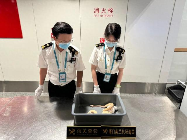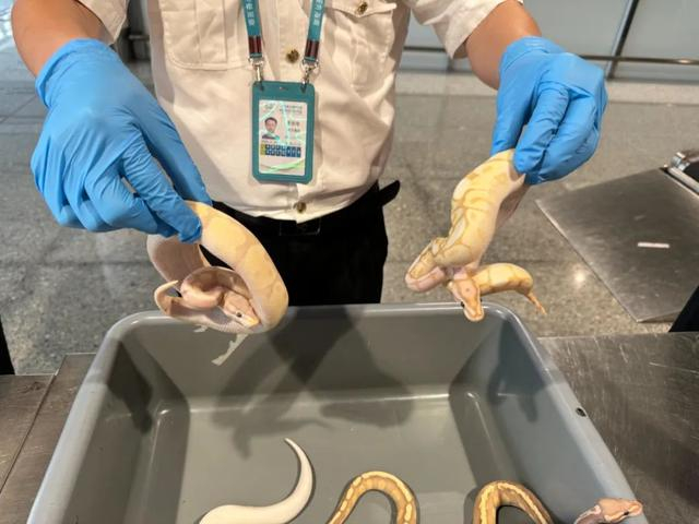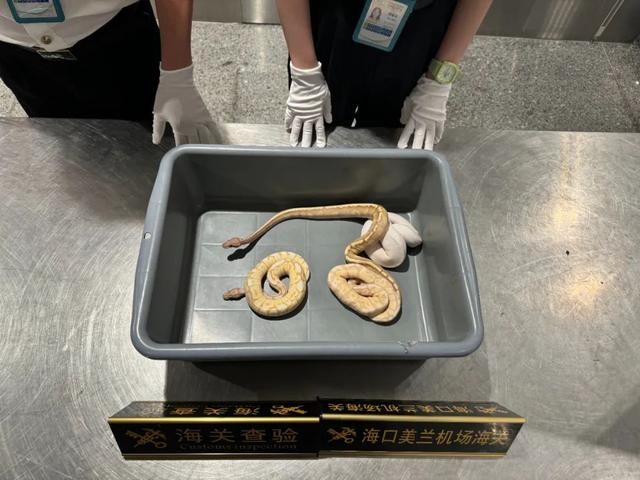 海口美兰机场海关查获4条活体蛇 均为球蟒
