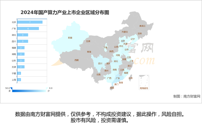从上市企业分布情况来看,A股35家国产算力相关上市企业分布在北京、广东、四川、湖北、天津等省市,总体来看企业主要集中于华北区域。