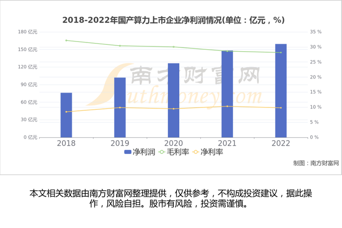 南方财富网趋势选股系统数据显示,2022年A股35家国产算力相关上市公司总体归母净利润为159.43亿元,同比增加7.44%,高于2021年水平。从国产算力行业利润率来看,2022年平均毛利率28.16%,较2021年有所下滑,平均净利率9.81%,较2021年有所下滑。