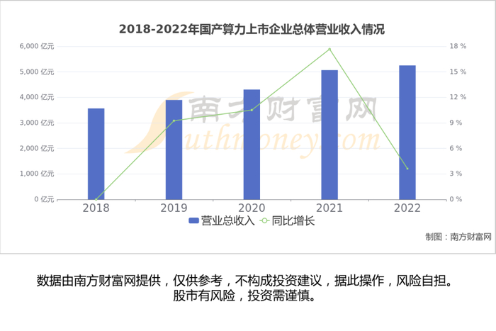 根据南方财富网趋势选股系统数据统计,A股国产算力相关上市企业目前数量有35家,2022年总体营业收入约为5251.91亿元,同比增加3.62%。国产算力上市公司2018至2022年总体营业收入情况如下: