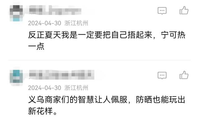 “不止女士要买,男士也很需要。灰色、黑色的款式,很受钓鱼人群、户外工作人群喜欢。”上周,董薇的店铺就来了两位男客户,这是在义乌工作的包工头,他们的目的很明确,要为工人采购戴着舒适轻便、防晒效果好的面罩,试戴了几款后,两人一次性买走100个。这些防晒面罩加入了帽檐,户外工作者可以不用戴着帽子出门了。