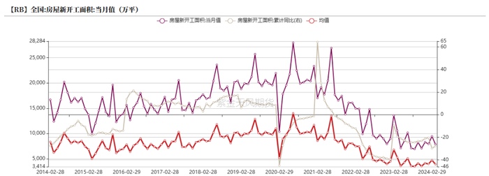 如上图中所示,2016-2019年期间地产新开工情况持续稳步上升,于2020年开始出现拐点,2021年之后受到房地产企业暴雷情况急剧回落。
