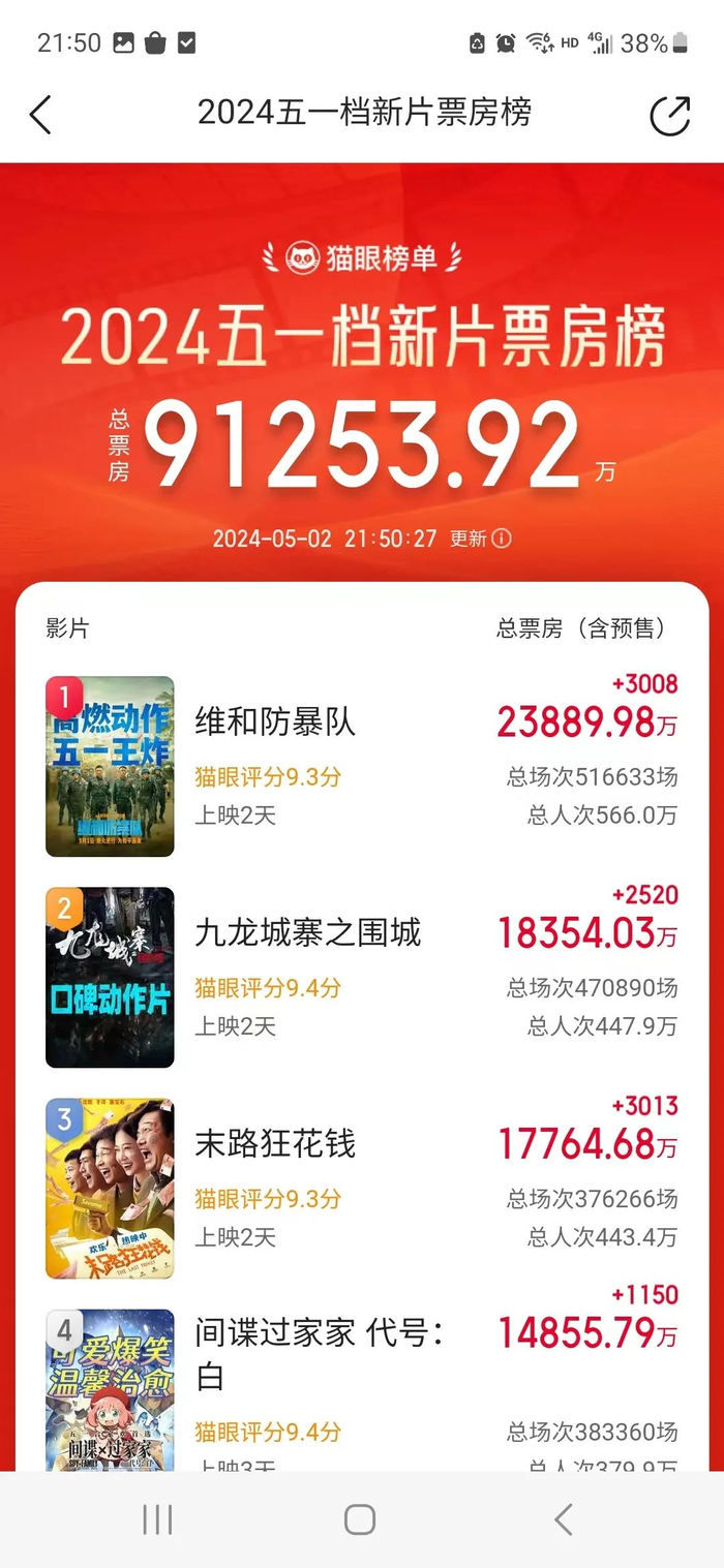 据猫眼专业版数据,截至5月2日21时50分,2024年五一档新片总票房(含预售)达9.13亿元。其中,《维和防暴队》《九龙城寨之围城》《末路狂花钱》分列票房榜前三位。