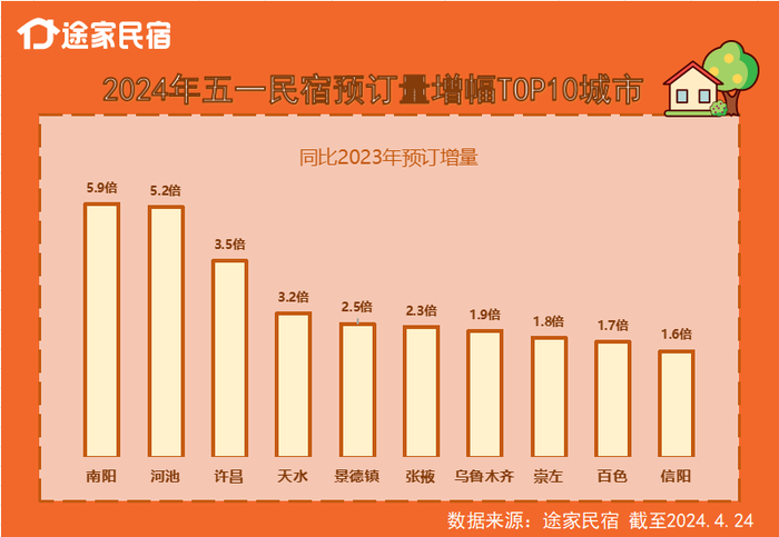 2024年五一民宿预定量增幅TOP10城市。(图/途家民宿)