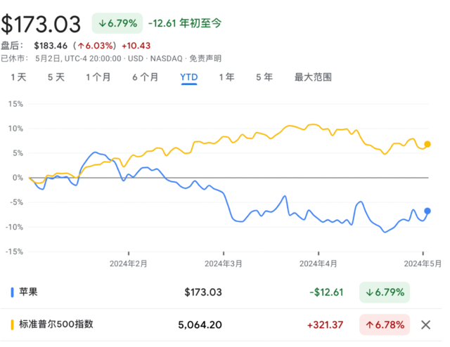 今年以来,苹果公司股价累计下跌逾6%,远不及标普500指数6.78%的涨幅。