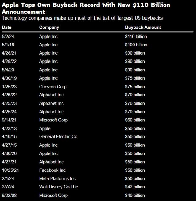 5月2日周四美股盘后,苹果公布2024财年第二财季业绩并宣布了美国史上最大的股票回购计划1100亿美元,同时将股息提高4%至每股25美分。