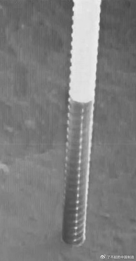 嫦娥六号的钻取采样装置是软管取芯的单杆钻取,其中2.5m长的钻杆主体采用铝基碳化硅材料,能够钻挖硬度8的岩石。根据可行性分析,在不影响起飞的极限倾斜着陆条件下钻机可钻取最小700mm、最大2376mm的月壤,在探测器着陆姿态水平的着陆状态下可钻取2009.5mm的月壤。这套机构在嫦娥五号任务中顺利展开并且实施了采样,但可惜由于着陆点月表下方0.9m就是坚硬而复杂的多层岩石,并且深层月壤糊住了钻头,无法继续向下钻取。为避免持续高功率钻挖岩石导致钻取电机故障,甚至导致整器掉电,嫦娥五号没有强行向下钻探而是在有效深度1004mm处终止了钻取采样,嫦娥六号钻取采样装置继承嫦娥五号,尺寸并没有太大的变化,但钻头经过了优化避免发生嫦娥五号任务中的意外事件再次发生。