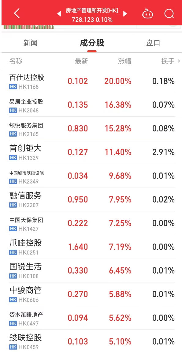5月3日,港股房地产板块中多只个股大涨。截至发稿,百仕达控股(HK1168)涨20%;易居企业控股(HK2048)涨16.38%;领悦服务集团(0HK2165)涨15.28%;首创钜大(HK1329)涨11.40%.