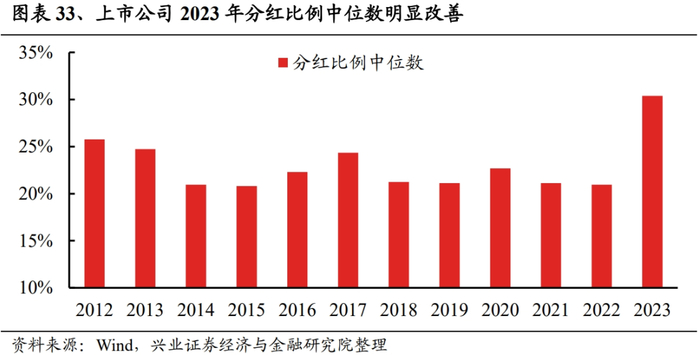 动态来看,社会服务行业2023年分红比例中位数较2022年出现大幅改善(+22.82pct),除了受益于公司分红比例的普遍改善外,更大的贡献来自于2023年行业内分红个股数量占比较2022年显著提升(+24.36pct)。传媒(+21.34pct)、纺织服饰(+18.03pct)、商贸零售(+17.90pct)的2023年分红比例中位数改善幅度也相对居前。同期,房地产(-9.13pct)、农林牧渔(-8.69pct)的2023年分红比例中位数则较往年出现明显下行,主要由于行业基本面下行,难以支撑大比例分红。