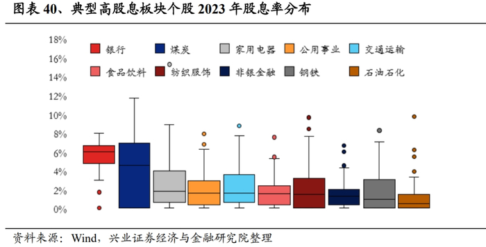 进一步观察一级行业个股2023年股息率分布,银行板块股息率中位数最高(5.98%),且个股股息率水平分布相对集中,绝大多数个股的股息率均在3%以上。煤炭板块个股2023年股息率中位数(4.52%)次之,其他板块股息率中位数均在2%以下。石油石化板块的2023年股息率中位数相对较低(0.49%),但“三桶油”为代表的龙头公司高股息特征比较显著。