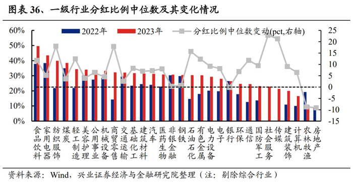 一级行业来看,消费品板块的分红比例普遍较高。将一级行业按照2023年分红比例中位数降序排列,食品饮料(49.59%)、家用电器(43.50%)、纺织服饰(39.90%)以及轻工制造(34.35%)均处在前五位。此外,2023年煤炭行业的分红比例中位数也达到38.47%,排名第四。