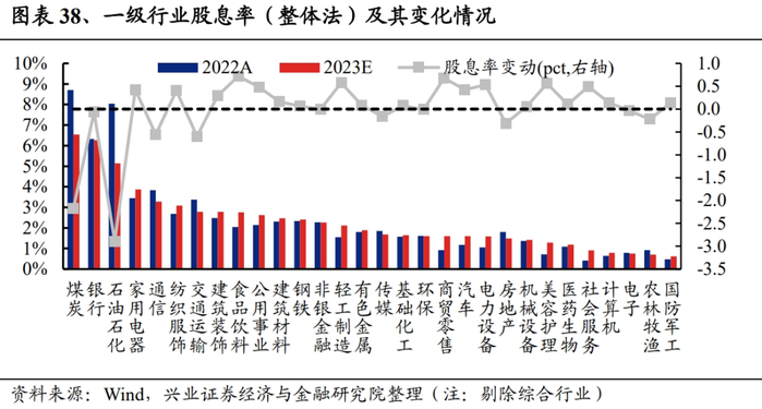 兴证策略:红利资产大扩容,2023全A分红情况概览,72.5%的A股上市公司预计实施分红,煤炭股息率最高