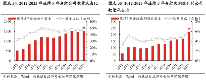 2023年上市公司分红积极性、持续性均显著提升。2023年全A分红比例[1]中位数为30.37%,较2022年的20.96%大幅提升9.41pct,显示上市公司分红力度明显改善。其中,连续5年分红的公司数量占比由2022年的45.82%提升1.65pct至2023年的47.47%,连续3年分红比例持续改善的公司数量占比则由2022年的4.79%提升1.38pct至2023年的6.17%,指向随着A股分红制度的日渐完善,上市公司分红的稳定性和可预见性正在逐步提升。