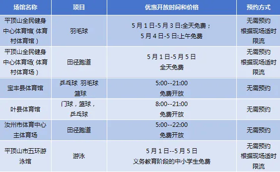 平顶山市共有平顶山全民健身中心体育馆(体育村体育馆)、平顶山全民健身中心体育场(体育村体育场)、宝丰县体育馆、叶县体育馆、汝州市体育中心主体育场、平顶山市五环游泳馆等6个场馆面向市民免低收费开放。