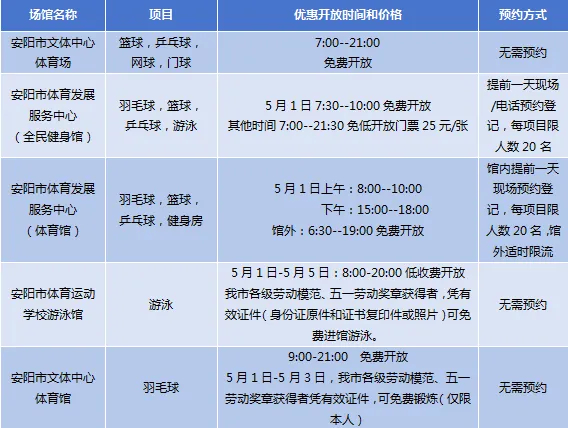 安阳市共有安阳市文体中心体育场、安阳市体育发展服务中心(全民健身馆)、安阳市体育发展服务中心(体育馆)、安阳市体育运动学校游泳馆、安阳市文体中心体育馆等5个场馆面向市民免低收费开放。