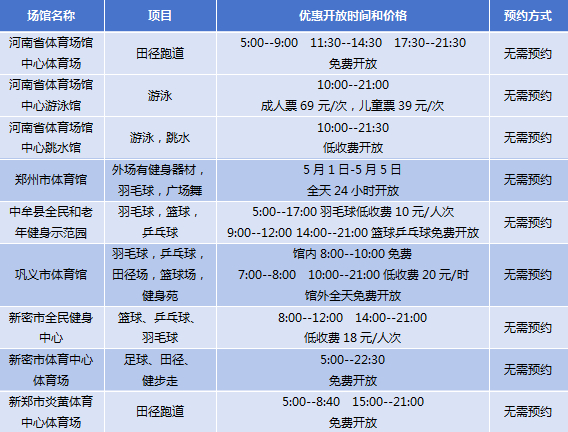 五一假期期间,郑州市共有河南省体育场馆中心体育场、河南省体育场馆中心游泳馆、河南省体育场馆中心跳水馆、郑州市体育馆、中牟县全民和老年健身示范园、巩义市体育馆、新密市全民健身中心、新密市体育中心体育场、新郑市炎黄体育中心体育场等9个场馆面向市民免低收费开放。